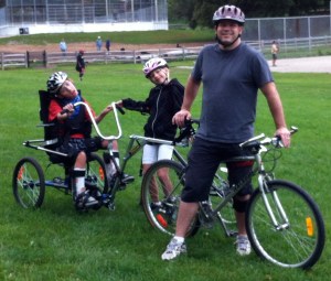 I would be lying to say we don’t still have those moments, but we are learning from them. Deane has a new adapted adult tricycle. The front wheel can be replaced by a bar that attaches to my husband’s bike much like the regular tag-along that a converts a parent’s bicycle into a tandem bike.