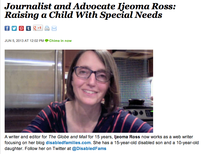 This week I am participating in a conversation on iVillage.ca about raising special needs children. The chat is hosted by noted pregnancy author Ann Douglas and includes blogger Lisa Thornbury and writer Catrina Carefoot. We cover the joys, sorrows and challenges of raising special needs kids. Check it out.